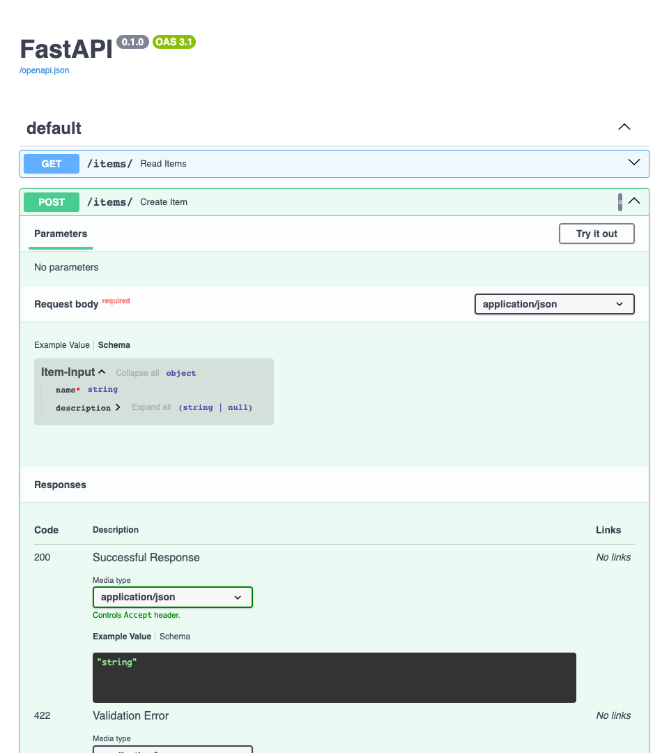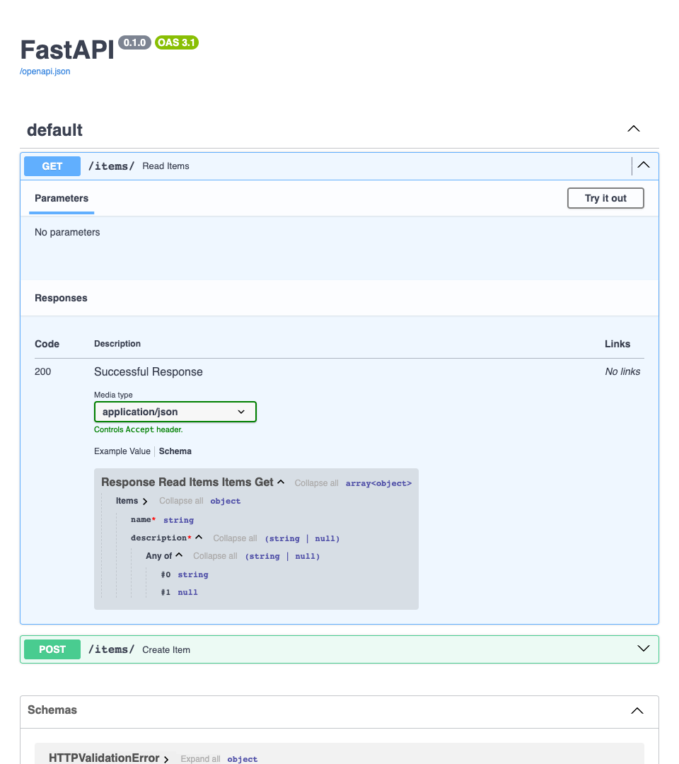 And if you check all the available Schemas (JSON Schemas) in OpenAPI, you will see that there are two, one Item-Input and one Item-Output.
